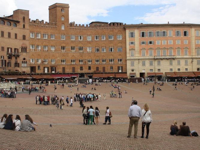 Tja und jetzt kommt wieder das liebe GPS mit seinen doofen weissen Strassen ins Spiel. Es führt uns durch immer enger werdende Wege kreuz und quer durch die Gegend, steil hinauf und wieder hinunter und unser treues Gefährt stöhnt still vor sich hin. Zum Glück müssen wir nie an den engsten Stellen kreuzen, aber wir warten nur darauf, dass wir stecken bleiben, was zum Glück nicht geschieht, und nach gut drei Kilometer zweigen wir endlich auch wieder auf eine Hauptstrasse ein. Entsorgungsstation wird gefunden und es ist erst noch eine die gut funktioniert, und auch den grossen Parkplatz vor Siena finden wir problemlos. 20 Euro verlangen die hier egal ob man übernachten will oder nur ein paar Stunden bleiben möchte. Nun geht es wieder einmal zu Fuss weiter, aber eigentlich nur, weil wir nicht merken, dass ein Bus fahren würde...! Nachdem wir ein rechtes Stück der Strasse nach gewandert sind (was bei italienischen Verkehrsverhältnissen ja nicht ganz ungefährlich ist!), gelangen wir zum Stadttor. Von dort geht's per Rolltreppe hinauf nach Siena, das autofrei ist. Eine enge Gasse, gesäumt von hochgebauten alten Häusern empfängt uns und lässt uns einmal mehr staunen. Wir spazieren furch die Gassen, treffen auf liebenswerte Geschäfte und gelangen so zur Piazza del Campo.